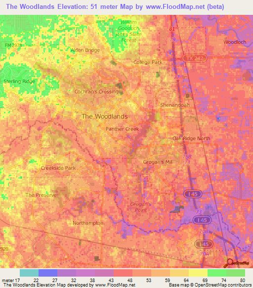 Topographic Map Of The Woodlands . Elevation of The Woodlands,US Elevation Map, Topography, Contour The Woodlands, Texas, United States of America • Visualization and sharing of free topographic maps. Average elevation: 47 m • The Woodlands, Montgomery County, Texas, United States • The Woodlands is in a heavily forested area, and much of the community has retained trees for shade and decoration